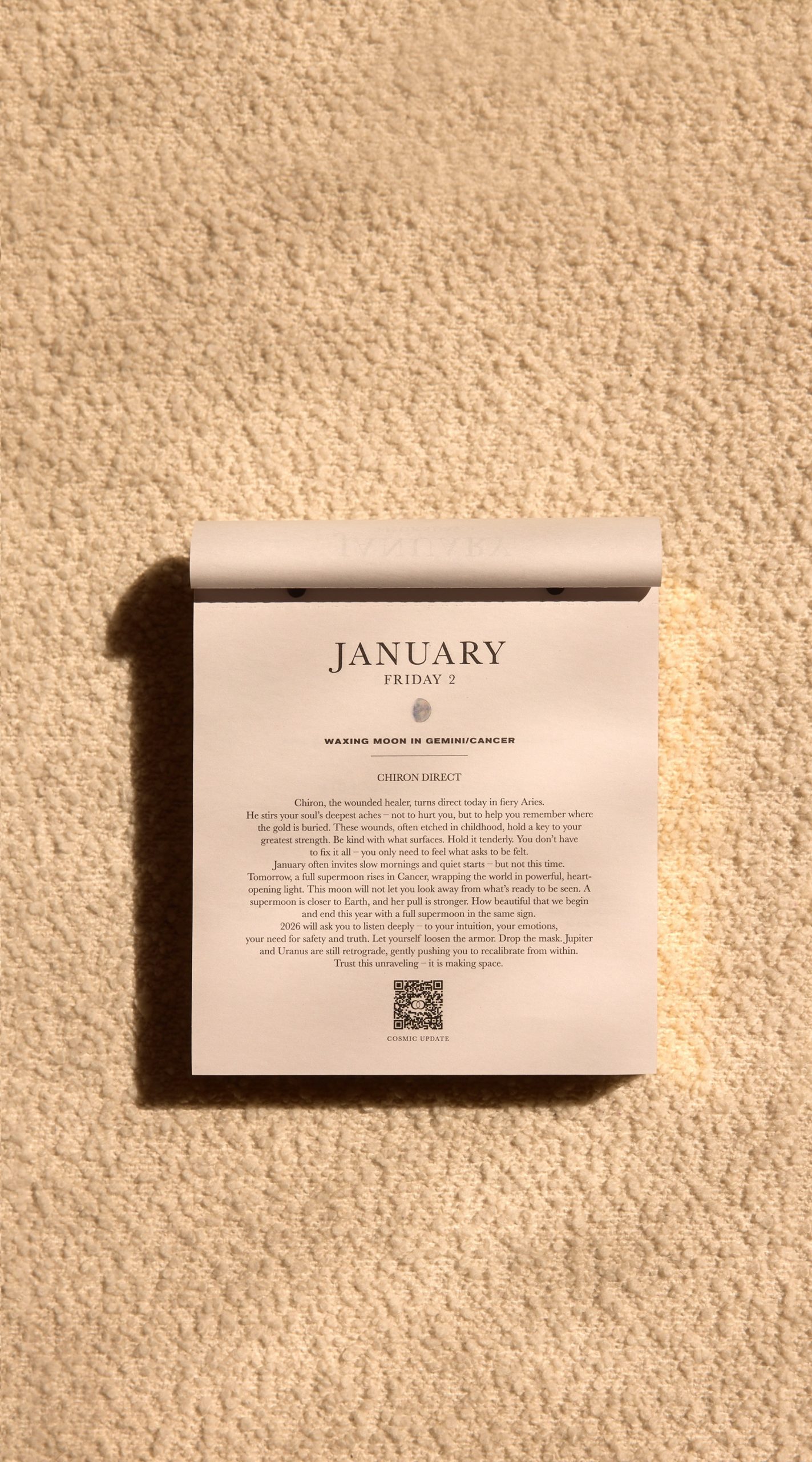 Diese Ausgabe ist aufwendig und in Vollfarbe illustriert und bietet dir aktuelle kosmische Updates über einen QR-Code. Sie begleitet dich 365 Tage lang mit Liebe, Einsichten und Inspiration – ergänzt durch Selbstreflexion, Affirmationen, Journaling-Ideen, Lifestyle-Tipps und faszinierende Fakten.